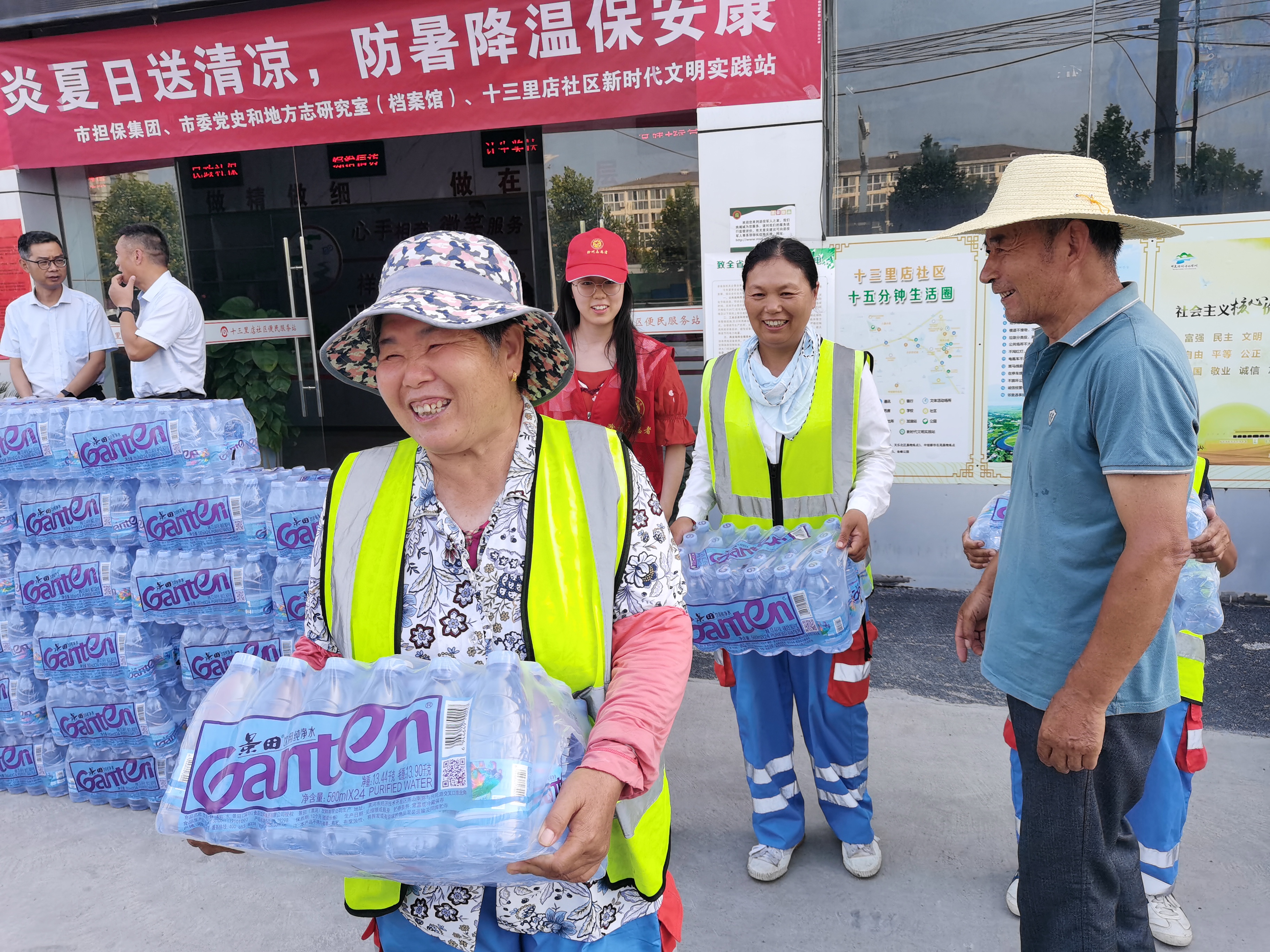 8月18日下午,兩個(gè)支部的黨員們帶上礦泉水等防暑降溫物品,來(lái)到十三里店社區(qū)黨群服務(wù)中心,與市黨史辦、十三里店社區(qū)的黨員群眾匯合,開展向社區(qū)環(huán)衛(wèi)工人送清涼送關(guān)愛(ài)行動(dòng),黨員志愿者們親手將一箱箱礦泉水分送到社區(qū)每一位環(huán)衛(wèi)工人手中,并向他們表示誠(chéng)摯的問(wèn)候,對(duì)他們?yōu)槌鞘械拿利悺⑸鐓^(qū)的整潔和我們生活環(huán)境的美好做出的奉獻(xiàn)表示敬意。環(huán)衛(wèi)工人們對(duì)黨員同志的關(guān)心關(guān)愛(ài)表達(dá)深深的感激之情。