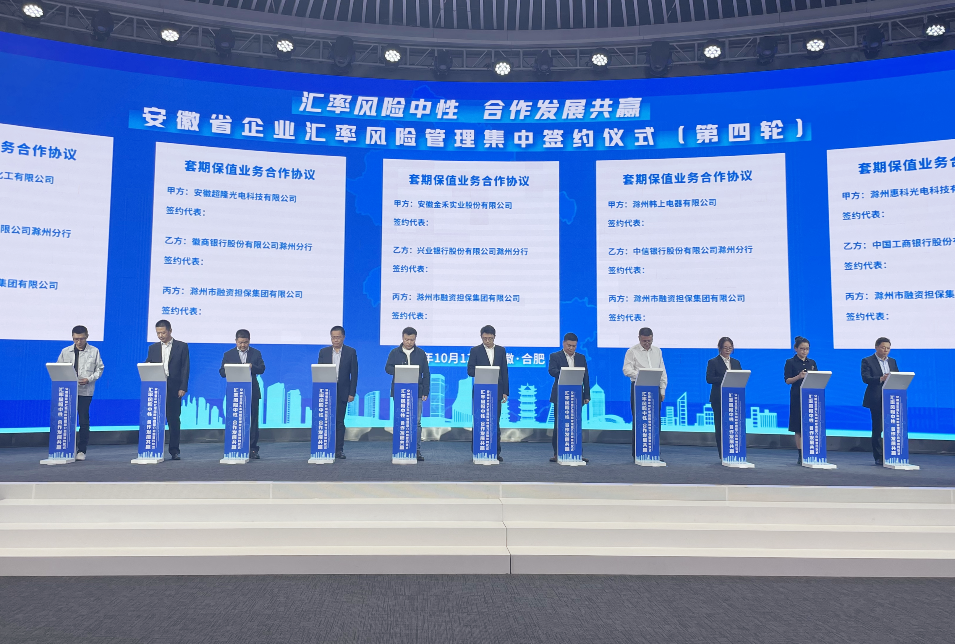 活動中,工商銀行總行匯率風(fēng)險管理專家牛麗群做匯率風(fēng)險中性主題宣介,安徽省興泰融資擔保集團有限公司負責人以及2家企業(yè)代表分別做匯率風(fēng)險分擔政策講解和匯率風(fēng)險管理經(jīng)驗分享。市擔保集團與滁州惠科光電科技有限公司等10家外貿(mào)企業(yè)及合作銀行進行外匯套保業(yè)務(wù)合作集中簽約。