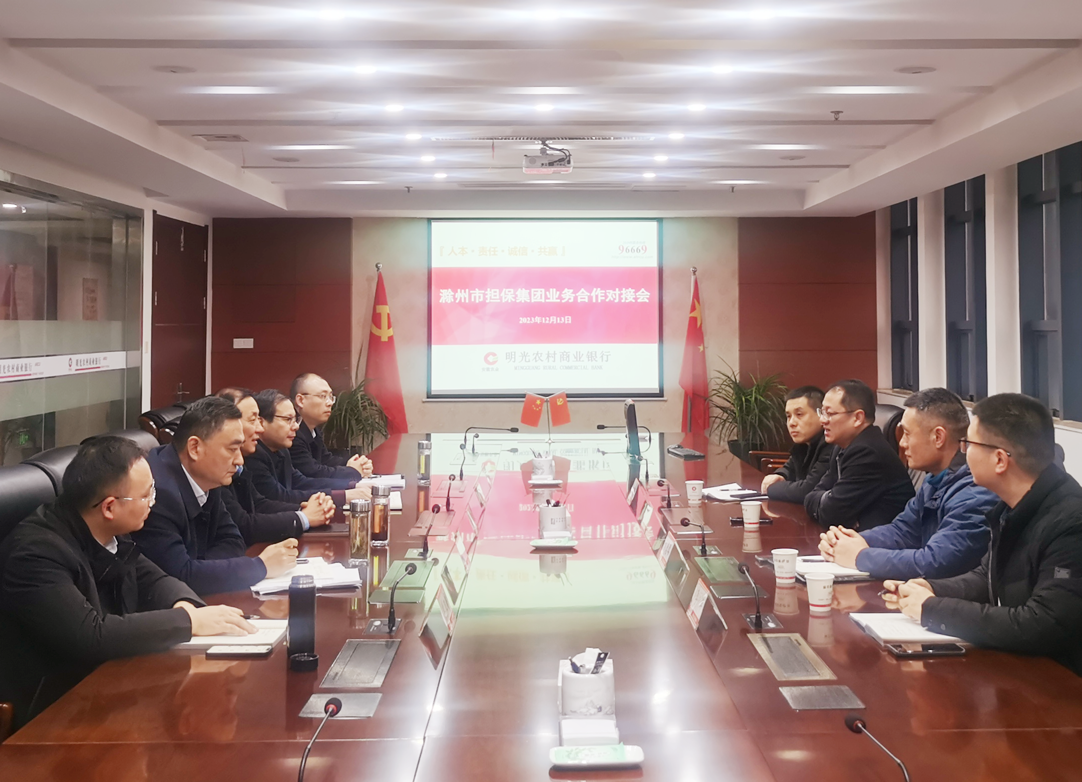 12月13日,市擔(dān)保集團(tuán)黨委委員、副總經(jīng)理張健帶隊(duì)前往明光農(nóng)商行開展業(yè)務(wù)交流,明光農(nóng)商行董事長任路明及相關(guān)領(lǐng)導(dǎo)參加座談。