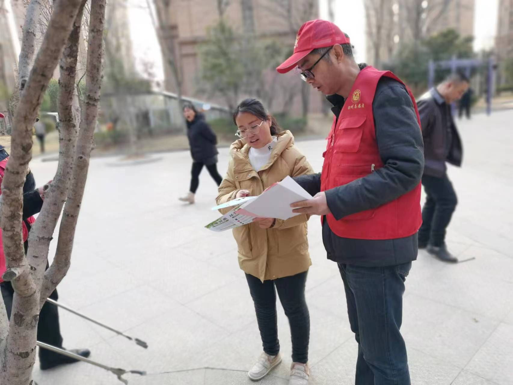 黨員志愿者向小區(qū)居民宣傳垃圾分類知識